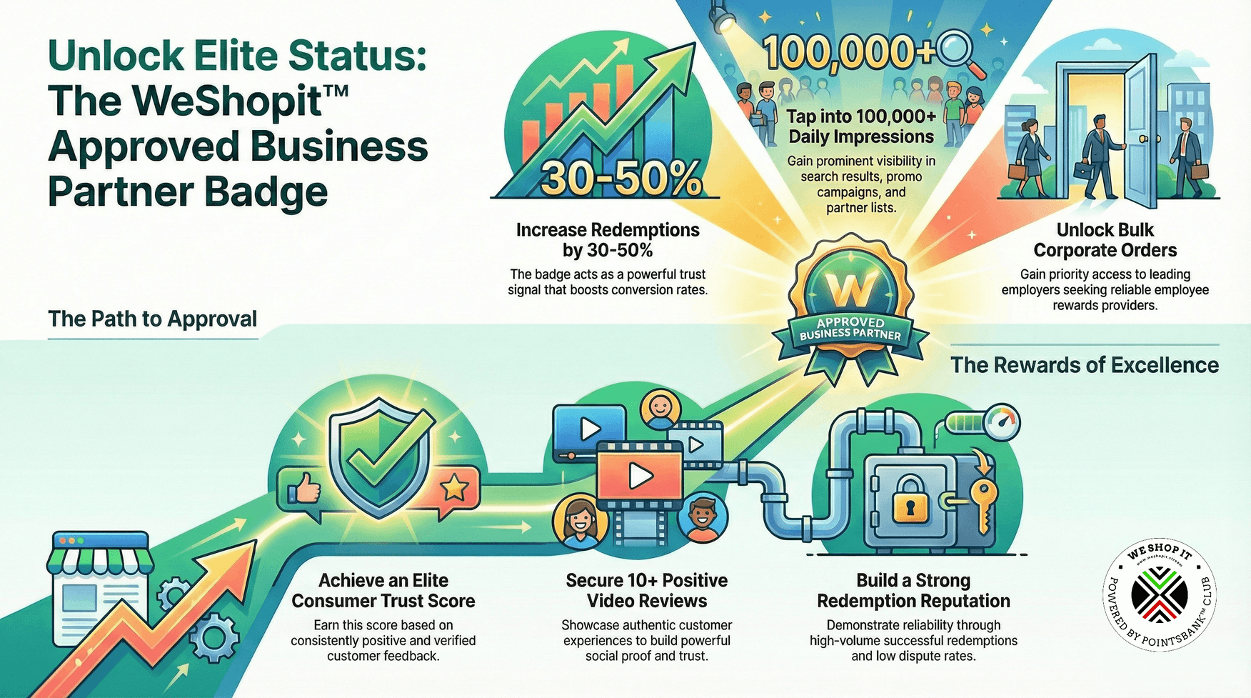 A: Secure 10+ positive video reviews, maintain a high redemption success rate, and achieve an elite consumer trust score. It's selective—only proven leaders qualify.