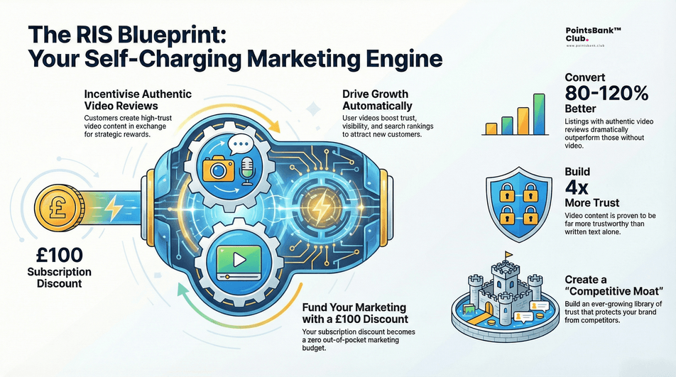 • Automated Content Generation: Unlike traditional advertising, where you pay for production, this model uses the RIS to incentivise customers to create authentic video reviews. These reviews are proven to convert 80-120% better than listings without video and build 4x more trust than written text alone.